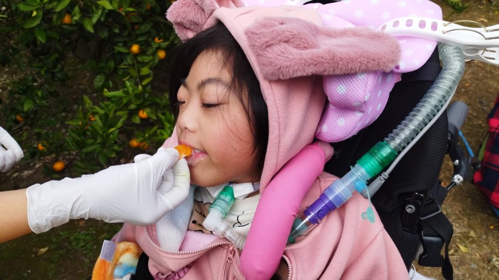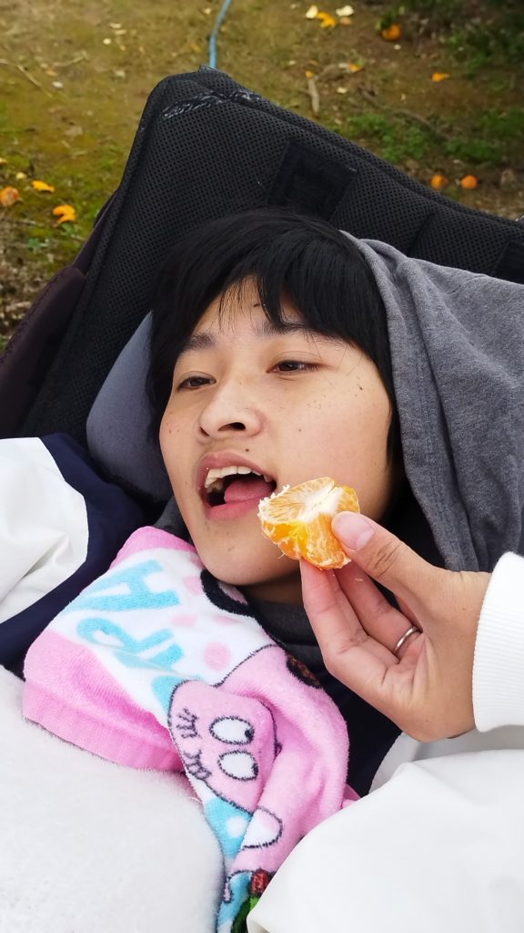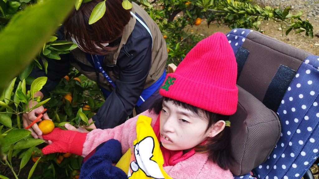 みかんをスタッフと一緒にハサミでちょきん!
